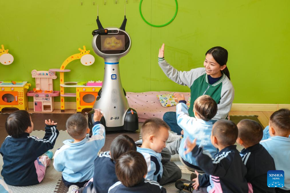 A teacher guides children of a nursery class to interact with a robot at a kindergarten in Laoling City, east China's Shandong Province, Nov. 4, 2025. Shandong Province has rolled out a series of policies such as developing childcare institutions, increasing kindergarten nursery classes, and offering childcare service in communities to promote its inclusive childcare system, with a focus on the caring of children under three years old. (Photo by Jia Peng/Xinhua)