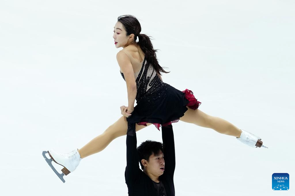 Sui Wenjing (top)/Han Cong of China perform during the pairs skating short program at ISU Figure Skating Grand Prix 2025 in Osaka, Japan, Nov. 7, 2025. (Xinhua/Jia Haocheng)