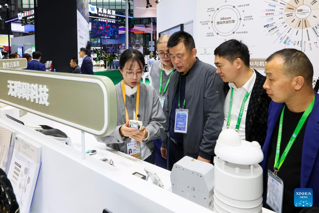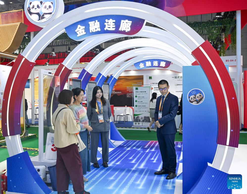 Visitors experience interactive installations at the booth of Shanghai Pudong Development Bank at the Trade in Services Exhibition area during the eighth China International Import Expo (CIIE) in east China's Shanghai, Nov. 9, 2025. The Service Trade Exhibition Area at this year's CIIE focuses on resource integration, attracting leading global service providers and industry clusters while enhancing the coordinated and open development of the service and manufacturing sectors. This creates more specialized enabling services to offer enterprises new opportunities for shared growth. (Xinhua/Chen Haoming)