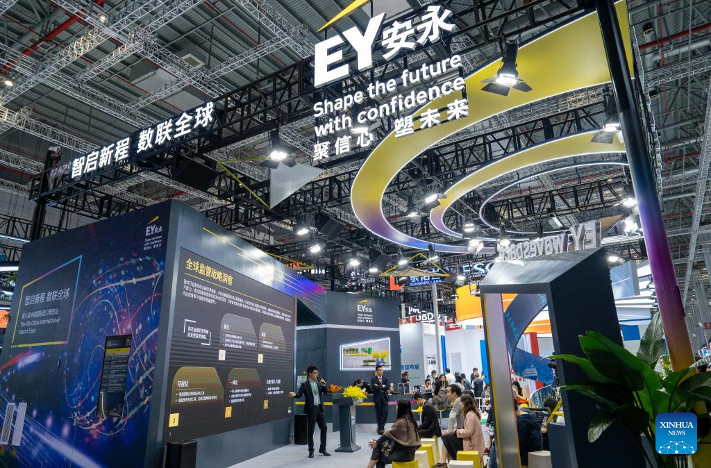This photo shows the booth of Ernst &Young (EY) at the Trade in Services Exhibition area during the eighth China International Import Expo (CIIE) in east China's Shanghai, Nov. 7, 2025. The Service Trade Exhibition Area at this year's CIIE focuses on resource integration, attracting leading global service providers and industry clusters while enhancing the coordinated and open development of the service and manufacturing sectors. This creates more specialized enabling services to offer enterprises new opportunities for shared growth. (Xinhua/Zhou Dixiao)