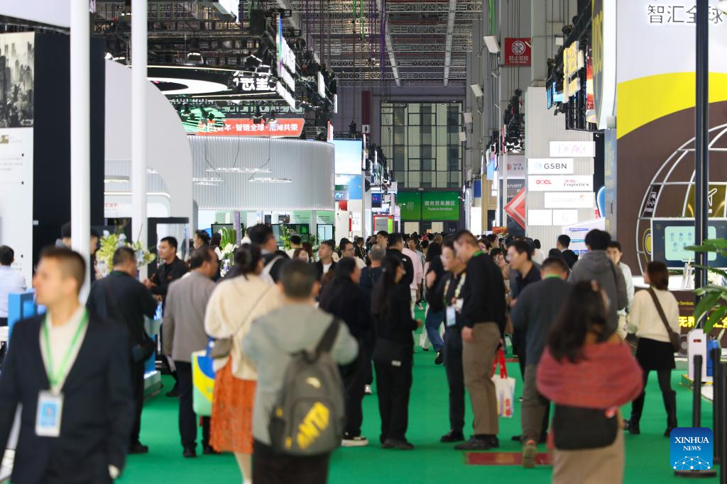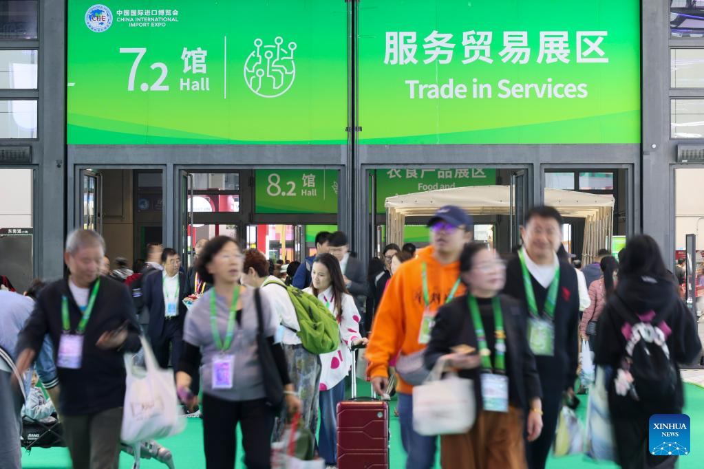 This photo shows the Trade in Services Exhibition area during the eighth China International Import Expo (CIIE) in east China's Shanghai, Nov. 9, 2025. The Service Trade Exhibition Area at this year's CIIE focuses on resource integration, attracting leading global service providers and industry clusters while enhancing the coordinated and open development of the service and manufacturing sectors. This creates more specialized enabling services to offer enterprises new opportunities for shared growth. (Xinhua/Wang Xiang)