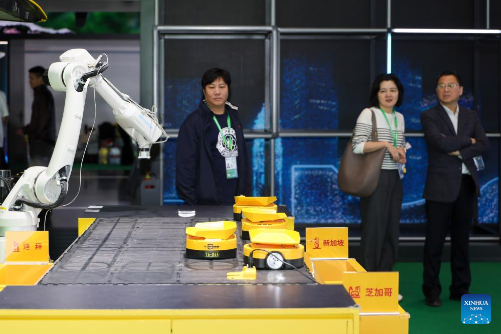 People look at a smart logistics system at the booth of DHL at the Trade in Services Exhibition area during the eighth China International Import Expo (CIIE) in east China's Shanghai, Nov. 9, 2025. The Service Trade Exhibition Area at this year's CIIE focuses on resource integration, attracting leading global service providers and industry clusters while enhancing the coordinated and open development of the service and manufacturing sectors. This creates more specialized enabling services to offer enterprises new opportunities for shared growth. (Xinhua/Wang Xiang)