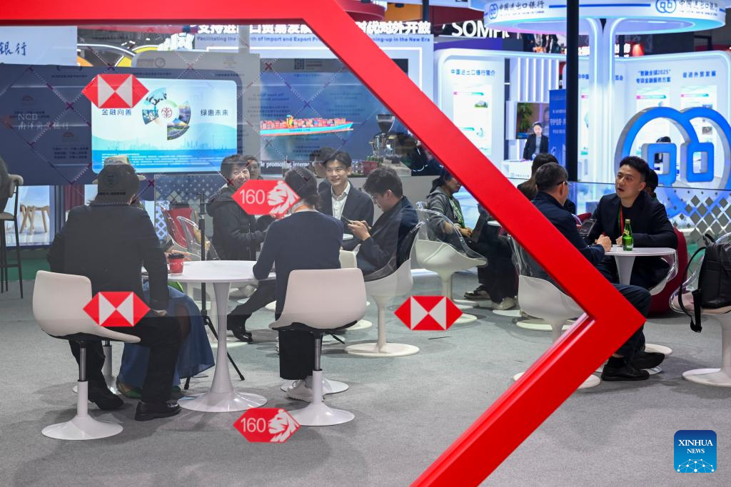 People communicate at the booth of HSBC Group at the Trade in Services Exhibition area during the eighth China International Import Expo (CIIE) in east China's Shanghai, Nov. 9, 2025. The Service Trade Exhibition Area at this year's CIIE focuses on resource integration, attracting leading global service providers and industry clusters while enhancing the coordinated and open development of the service and manufacturing sectors. This creates more specialized enabling services to offer enterprises new opportunities for shared growth. (Xinhua/Chen Haoming)