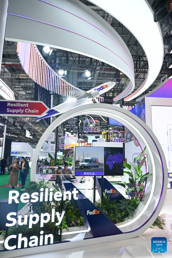 People talk at the booth of FedEx at the Trade in Services Exhibition area during the eighth China International Import Expo (CIIE) in east China's Shanghai, Nov. 9, 2025. The Service Trade Exhibition Area at this year's CIIE focuses on resource integration, attracting leading global service providers and industry clusters while enhancing the coordinated and open development of the service and manufacturing sectors. This creates more specialized enabling services to offer enterprises new opportunities for shared growth. (Xinhua/Chen Haoming)