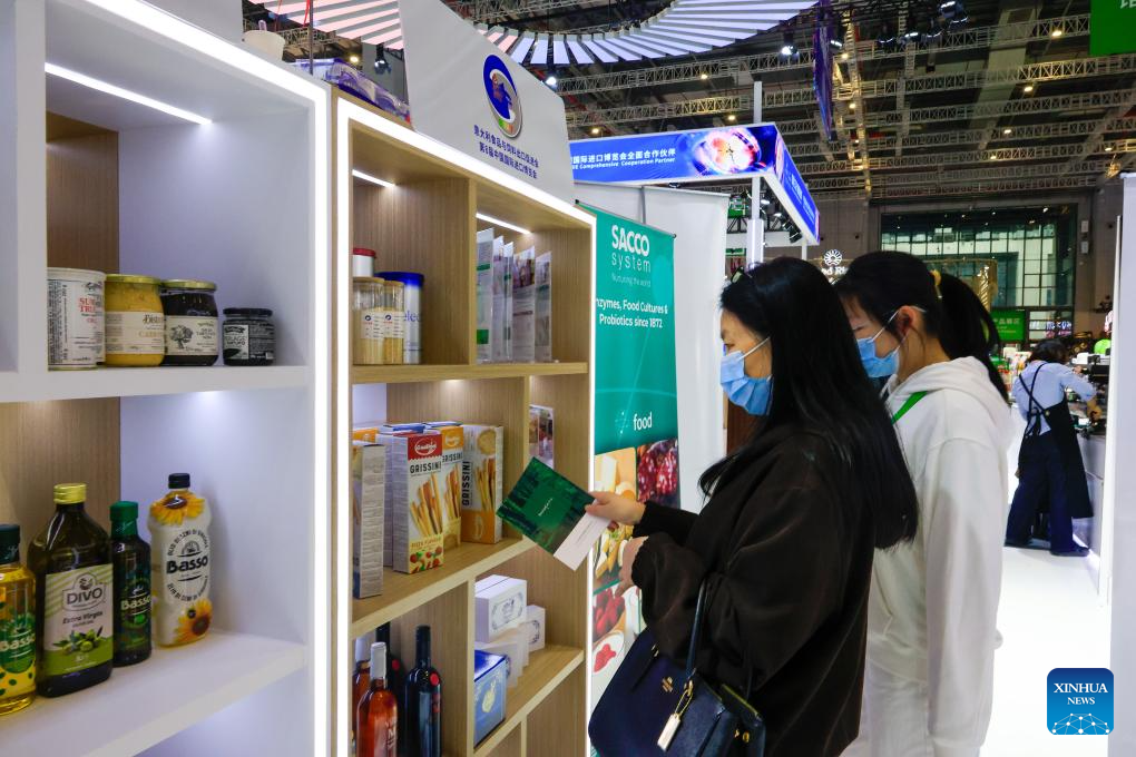 People visit the booth of Italian Food and Feed Export Promotion Association at the Food and Agricultural Products exhibition area during the eighth China International Import Expo (CIIE) in east China's Shanghai, on Nov. 9, 2025. Agriculture is an industrial pillar of Italy, a country which uses 56 percent of its land for agriculture. The country is home to about 1.6 million farm-based businesses, many of which make agri-food products prized worldwide for their quality and craftsmanship. Italian agri-food companies see the eighth China International Import Expo (CIIE) as a key gateway to the world's second-largest consumer market, where they seek greater space for sales and partnerships. (Xinhua/Liu Jiaqi)