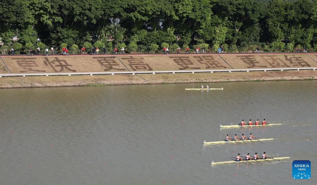 Teams compete during the men's quadruple sculls final of rowing at China's 15th National Games in Guangzhou, south China's Guangdong Province, Nov. 10, 2025. (Xinhua/Pan Yulong)