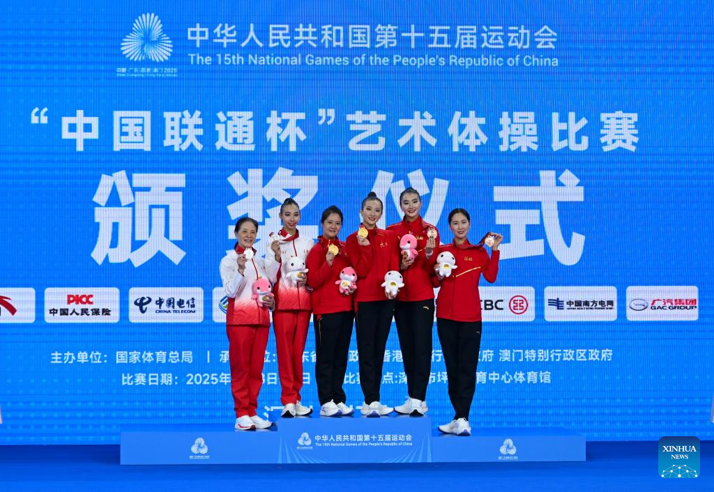 Gold medalist Wang Zilu (3rd R) of Shaanxi, silver medalist Wang Qi (2nd L) of Tianjin and bronze medalist Li Huilin (2nd R) of Hebei pose during the awarding ceremony for the individual all-around final of rhythmic gymnastics at China's 15th National Games in Shenzhen, south China's Guangdong Province, Nov. 10, 2025. (Xinhua/Hao Yuan)