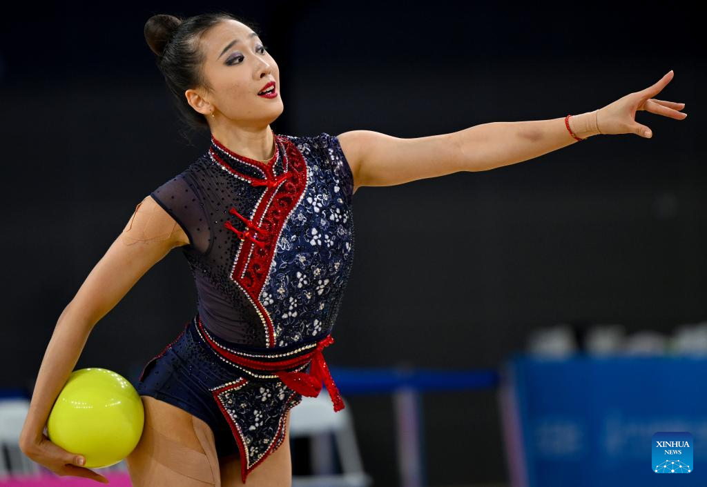 Wang Zilu of Shaanxi performs during the ball event of the individual all-around final of rhythmic gymnastics at China's 15th National Games in Shenzhen, south China's Guangdong Province, Nov. 10, 2025. (Xinhua/Hao Yuan)