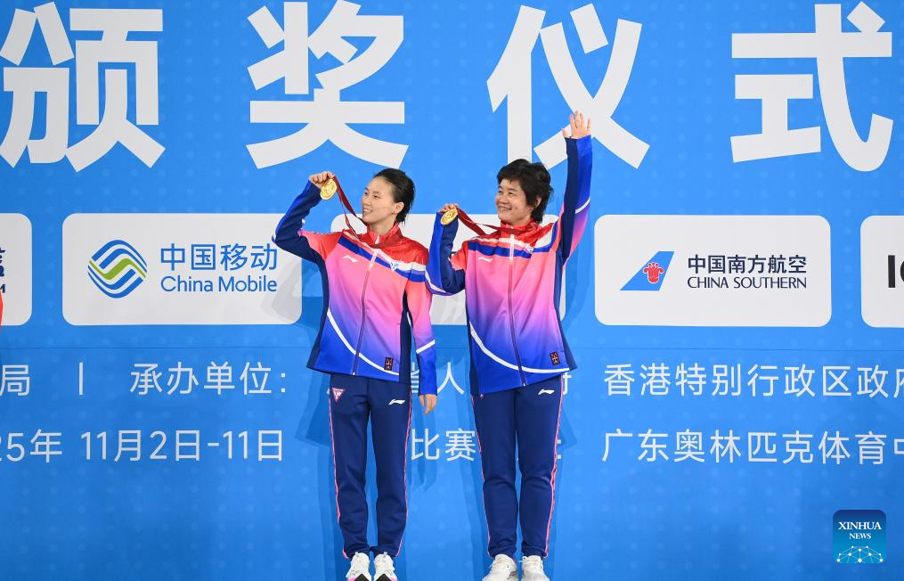 Gold medalist Chen Yuxi (L) of Shanghai shows the medal with her coach during the awarding ceremony for the women's 10m platform of diving at China's 15th National Games in Guangzhou, south China's Guangdong Province, Nov. 10, 2025. (Xinhua/Tang Yi)