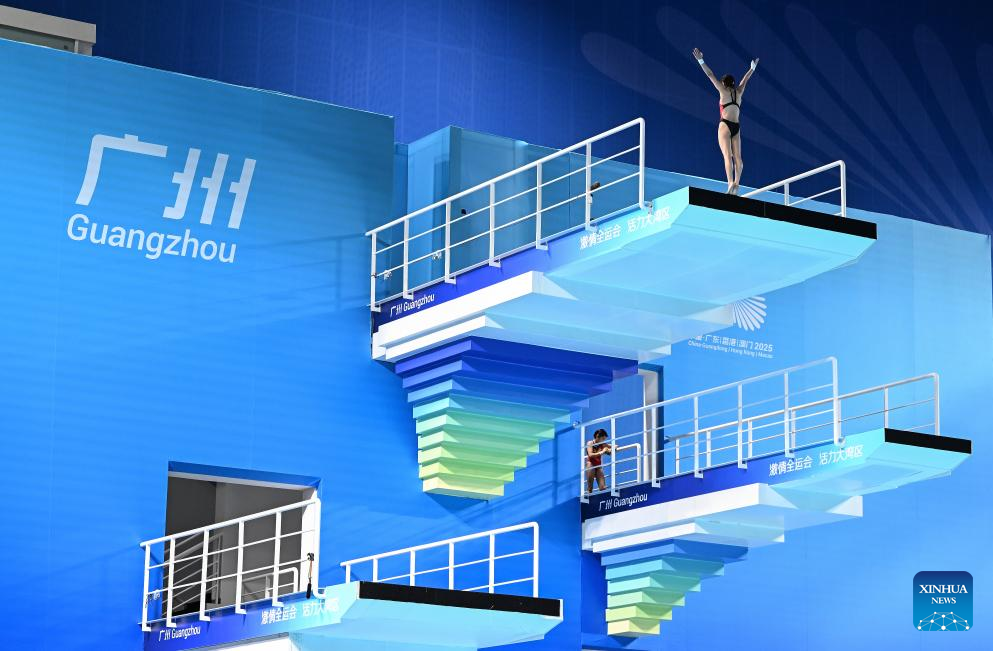Chen Yuxi of Shanghai competes during the women's 10m platform final of diving at China's 15th National Games in Guangzhou, south China's Guangdong Province, Nov. 10, 2025. (Xinhua/Tang Yi)