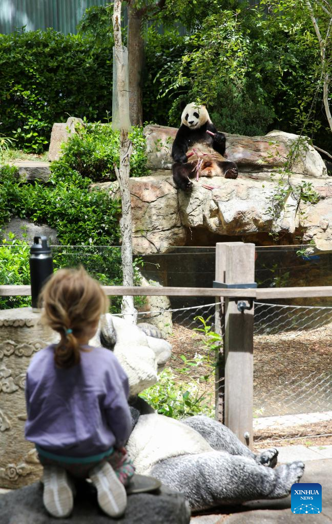 A girl looks at giant panda Yilan at Adelaide Zoo in Adelaide, Australia, Nov. 10, 2025. The giant panda pair Xingqiu, a male, and Yilan, a female, arrived in Adelaide on Dec. 15, 2024. According to the contract, they will spend ten years at Adelaide Zoo, replacing the pair Wangwang and Funi who returned to China last November after 15 years in Australia. (Xinhua/Ma Ping)