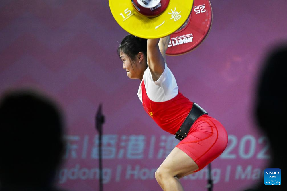 Deng Xiaofang of Hainan competes in clean and jerk during the weightlifting women's 49kg final at China's 15th National Games in Dongguan, south China's Guangdong Province, Nov. 10, 2025. (Xinhua/Yang Chenguang)