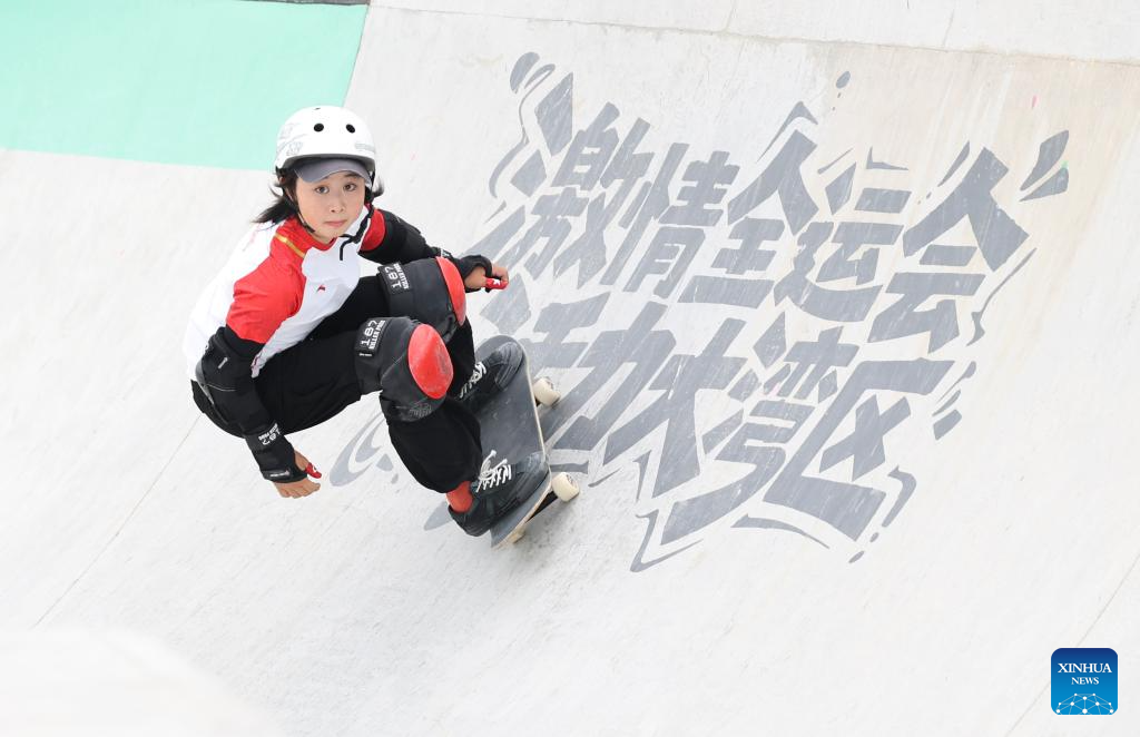 Zheng Haohao of Guangdong competes during the women's park final of skateboarding at China's 15th National Games in Huizhou, south China's Guangdong Province, Nov. 11, 2025. (Xinhua/Lu Hanxin)