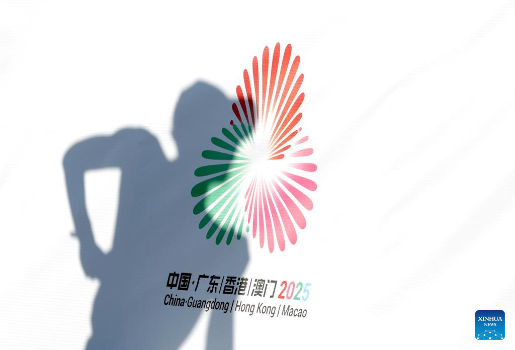 An athlete passes by the logo of China's 15th National Games while competing during the men's 20km race walk of athletics at China's 15th National Games in Zhuhai, south China's Guangdong Province, Nov. 12, 2025. (Xinhua/Mao Siqian)