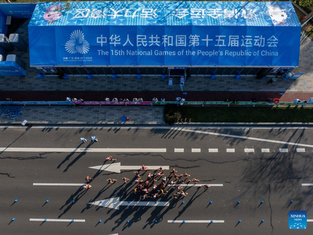 An aerial drone photo taken on Nov. 12, 2025 shows athletes competing during the men's 20km race walk of athletics at China's 15th National Games in Zhuhai, south China's Guangdong Province. (Xinhua/Mao Siqian)