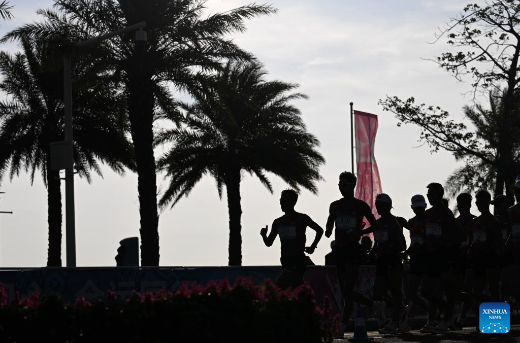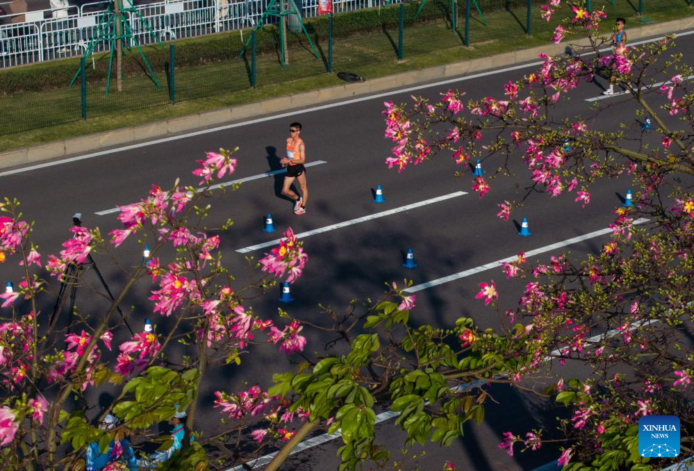 Athletes compete during the men's 20km race walk of athletics at China's 15th National Games in Zhuhai, south China's Guangdong Province, Nov. 12, 2025. (Xinhua/Lian Zhen)