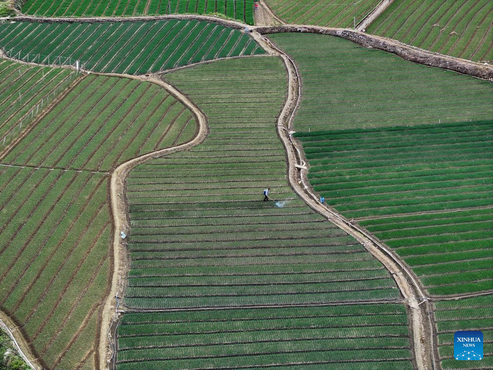 An aerial drone photo taken on Nov. 11, 2025 shows villagers planting chives in Longxing Village of Sandu Town in Liuzhou City, south China's Guangxi Zhuang Autonomous Region. Sandu Town has in recent years promoted the standardized and industrialized production of chives, and developed an integrated business system that ranges from planting and processing to sales and service. (Xinhua/Huang Xiaobang)