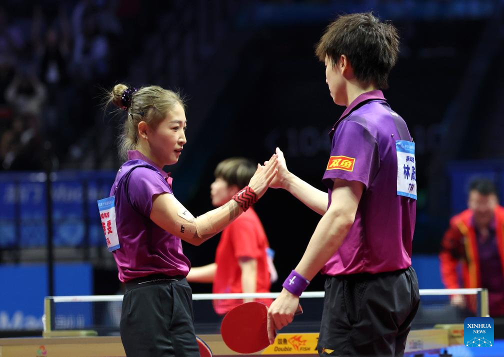 Yuan Licen/Wang Yidi (R) compete during the table tennis mixed doubles semifinal match between Lin Gaoyuan/Liu Shiwen of Guangdong and Yuan Licen/Wang Yidi of Liaoning at China's 15th National Games in Macao, south China, Nov. 13, 2025. (Xinhua/Chen Bin)