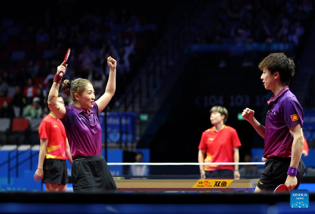 Yuan Licen/Wang Yidi (R) celebrate scoring during the table tennis mixed doubles semifinal match between Lin Gaoyuan/Liu Shiwen of Guangdong and Yuan Licen/Wang Yidi of Liaoning at China's 15th National Games in Macao, south China, Nov. 13, 2025. (Xinhua/Liu Xu)