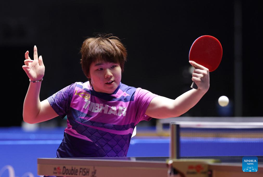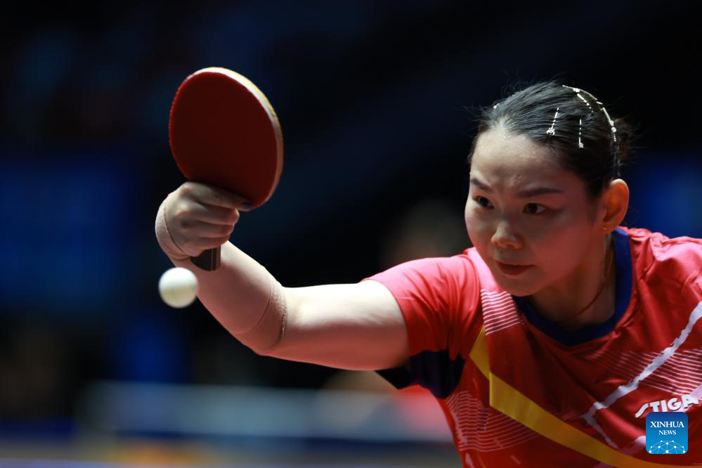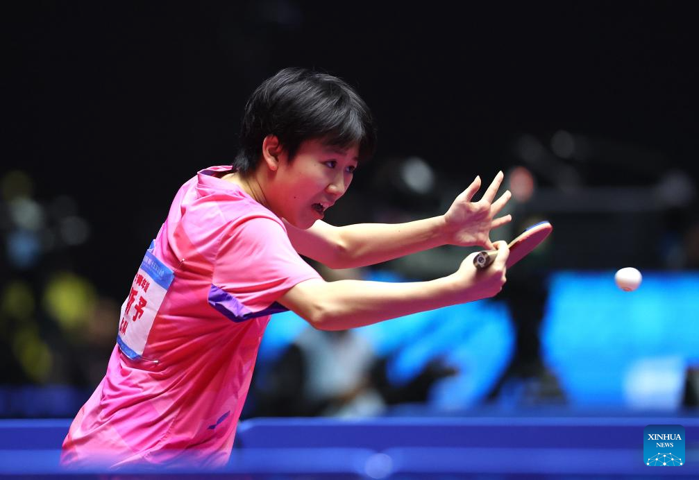 He Zhuojia hits a return during the table tennis women's singles round of 16 match between Chen Meng of Shandong and He Zhuojia of Hebei at China's 15th National Games in Macao, south China, Nov. 12, 2025. (Xinhua/Liu Xu)