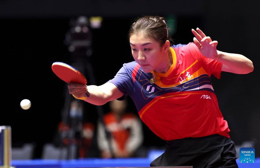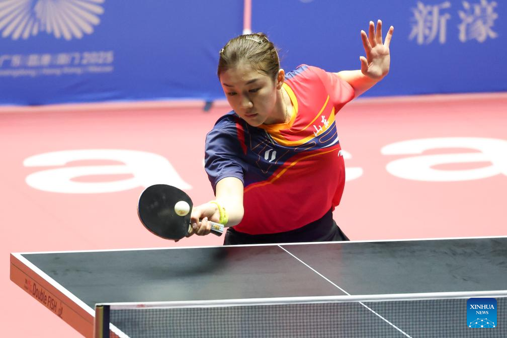 Sun Yingsha competes during the table tennis women's singles round of 16 match between Sun Yingsha of Hebei and Wang Xiaotong of Shandong at China's 15th National Games in Macao, south China, Nov. 12, 2025. (Xinhua/Liu Xu)