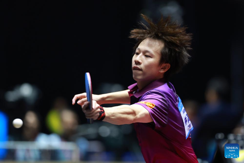 Lin Gaoyuan hits a return during the table tennis men's singles round of 16 match between Lin Gaoyuan of Guangdong and Niu Guankai of Henan at China's 15th National Games in Macao, south China, Nov. 12, 2025. (Xinhua/Liu Xu)