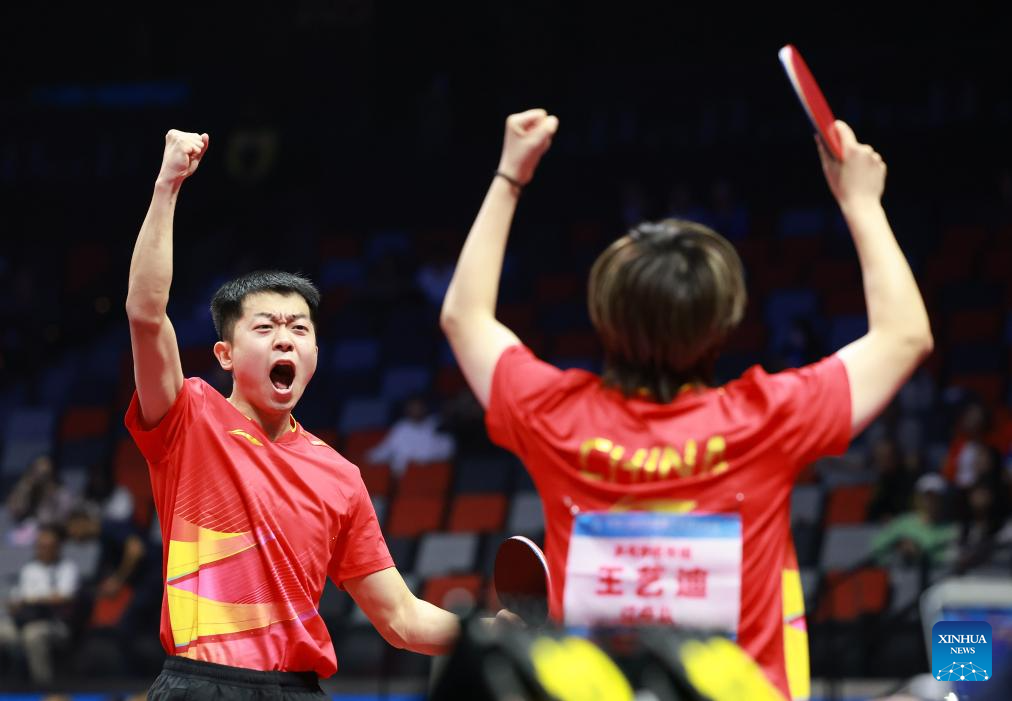 Lin Gaoyuan/Liu Shiwen (L) celebrate after winning the table tennis mixed doubles semifinal match between Lin Gaoyuan/Liu Shiwen of Guangdong and Yuan Licen/Wang Yidi of Liaoning at China's 15th National Games in Macao, south China, Nov. 13, 2025. (Xinhua/Liu Xu)