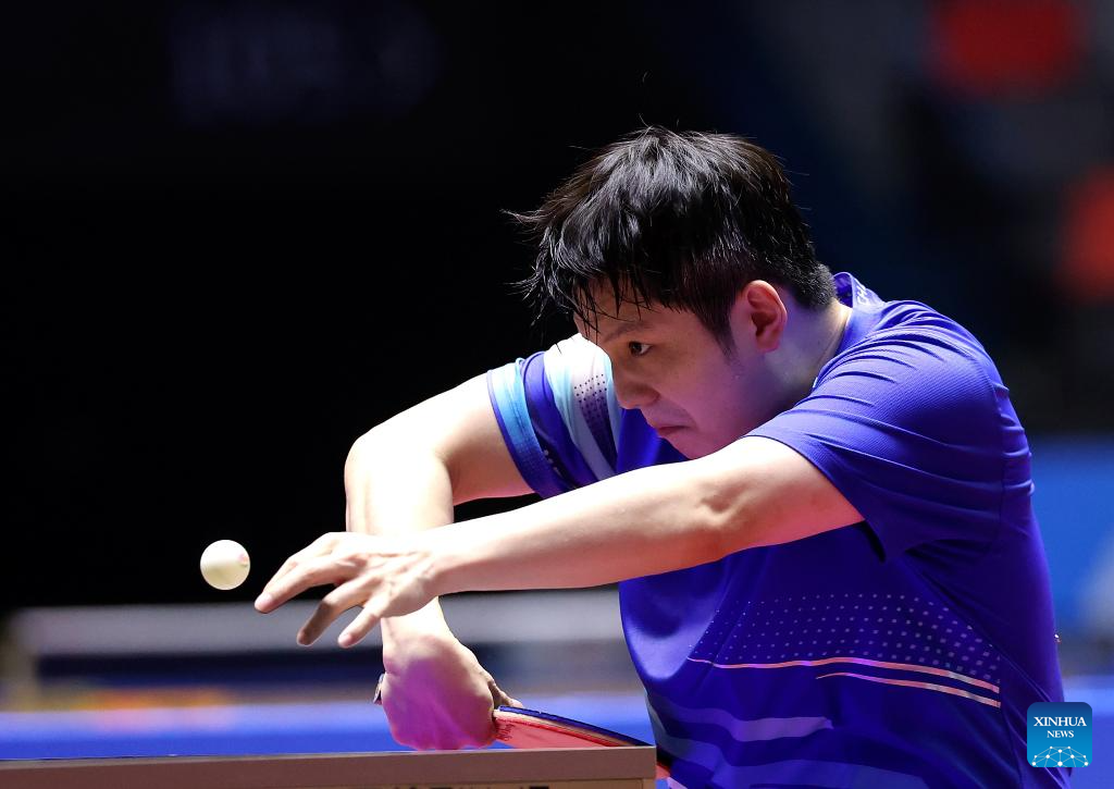Fan Zhendong hits a return during the table tennis men's singles quarterfinal match between Fan Zhendong of Shanghai and Sun Zheng of Zhejiang at China's 15th National Games in Macao, south China, Nov. 13, 2025. (Xinhua/Liu Xu)