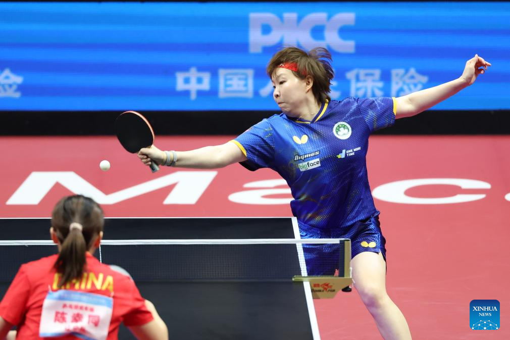 Zhu Yuling (top) hits a return during the table tennis women's singles quarterfinal match between Zhu Yuling of Macao and Chen Xingtong of Liaoning at China's 15th National Games in Macao, south China, Nov. 13, 2025. (Xinhua/Liu Xu)