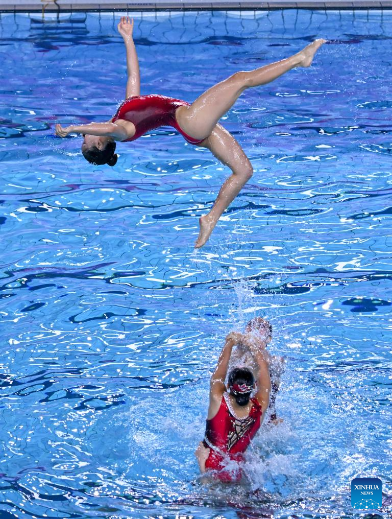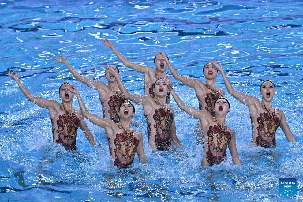 Team Beijing Sport University perform during the team technical of artistic swimming at China's 15th National Games in Jiangmen, south China's Guangdong Province, Nov. 13, 2025. (Xinhua/Chen Zhonghao)