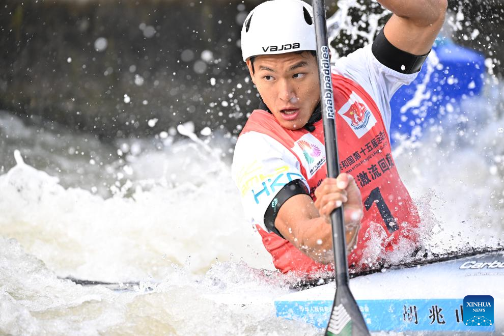 Hu Zhaoshan of Guangdong competes during the men's kayak single final of canoe slalom at China's 15th National Games in Guangzhou, south China's Guangdong Province, Nov. 13, 2025. (Xinhua/Xiao Yijiu)