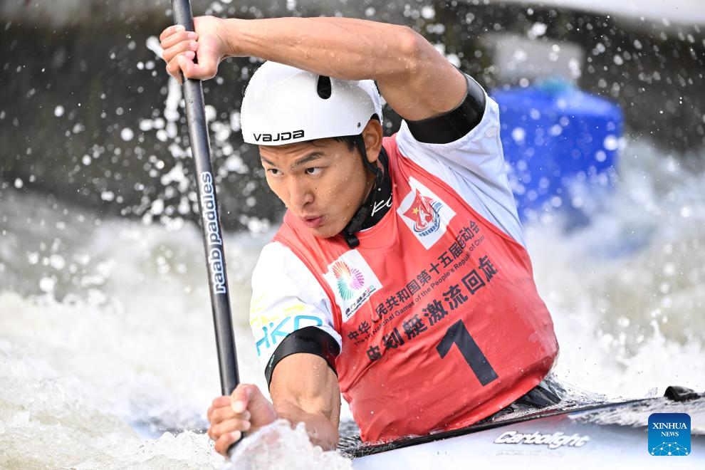 Quan Xin of Fujian competes during the men's kayak single final of canoe slalom at China's 15th National Games in Guangzhou, south China's Guangdong Province, Nov. 13, 2025. (Xinhua/Tang Yi)