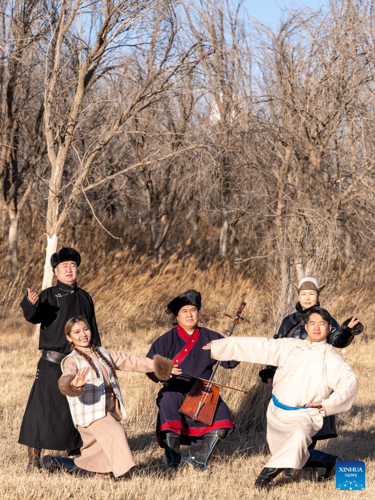 Actors with the Ulan Muqir art troupe perform during a rehearsal in Sonid Right Banner of Xilingol League, north China's Inner Mongolia Autonomous Region, Nov. 13, 2025. (Xinhua/Ma Jinrui)
