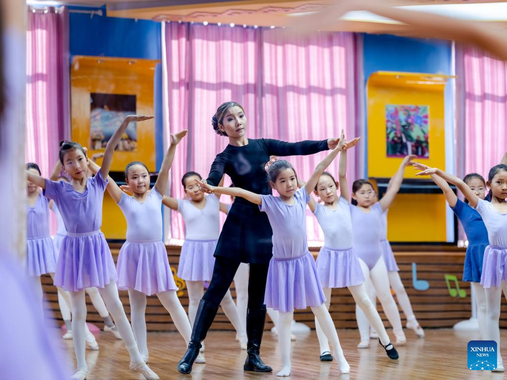 Esnil instructs students in dancing at a primary school in Sonid Right Banner of Xilingol League, north China's Inner Mongolia Autonomous Region, Nov. 13, 2025. (Xinhua/Ma Jinrui)
