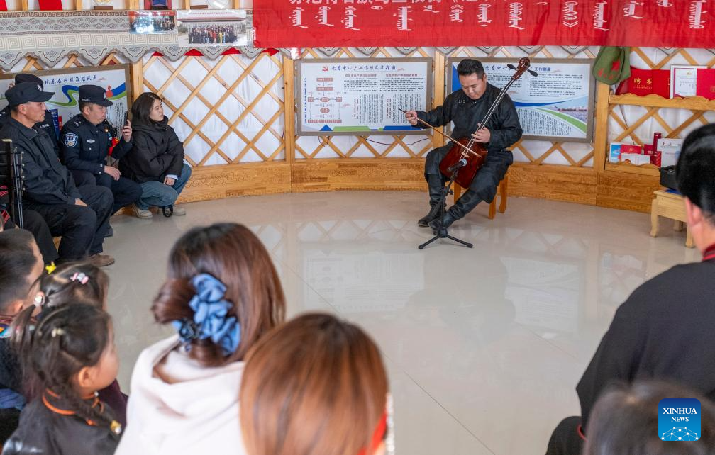 Oyunjargal plays the morin khuur at a border guard station in Jihuulengt Gacha of Erenuur Sumu, Sonid Right Banner, Xilingol League, north China's Inner Mongolia Autonomous Region, Nov. 12, 2025. (Xinhua/Ma Jinrui)