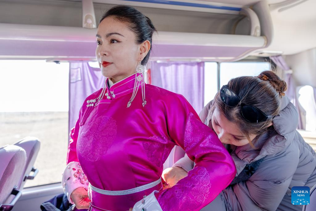 An actress with the Ulan Muqir art troupe changes her clothes on a bus heading for a performance in the countryside in Sonid Right Banner of Xilingol League, north China's Inner Mongolia Autonomous Region, Nov. 12, 2025. (Xinhua/Ma Jinrui)