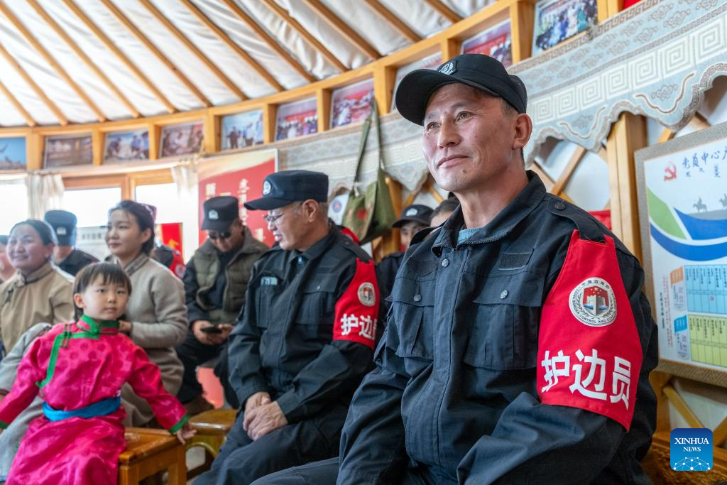 Border patrolmen and audience watch a performance given by the Ulan Muqir art troupe at a border guard station in Jihuulengt Gacha of Erenuur Sumu, Sonid Right Banner, Xilingol League, north China's Inner Mongolia Autonomous Region, Nov. 12, 2025. (Xinhua/Ma Jinrui)