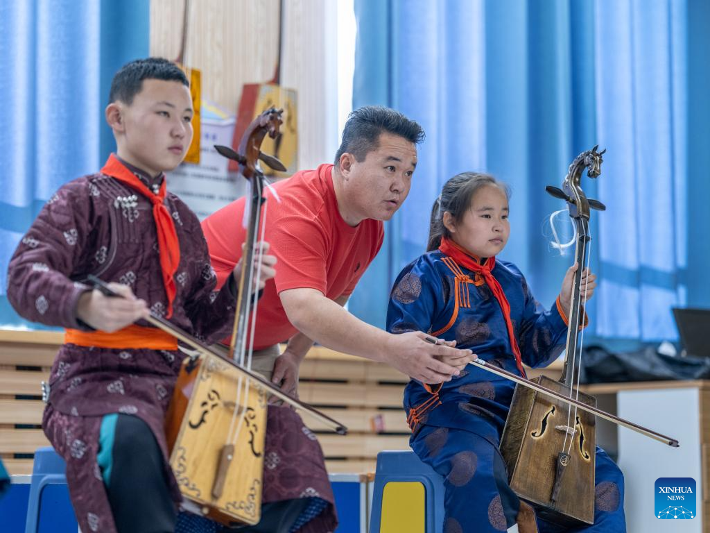 Oyunjargal (C) instructs students in playing the morin khuur at a primary school in Sonid Right Banner of Xilingol League, north China's Inner Mongolia Autonomous Region, Nov. 13, 2025. (Xinhua/Ma Jinrui)