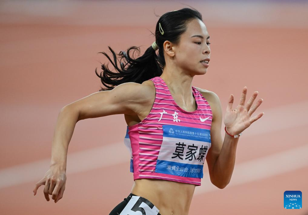 Mo Jiadie of Guangdong competes during the women's 400m hurdles final of athletics at China's 15th National Games in Guangzhou, south China's Guangdong Province, Nov. 17, 2025. (Xinhua/Jiang Han)