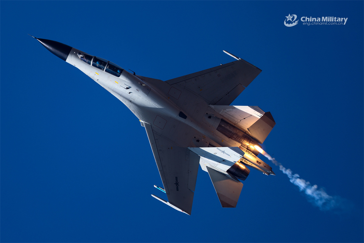 A J-11BS fighter jet attached to a regiment under the Chinese PLA Naval Aviation University releases flares during a combat training exercise. (eng.chinamil.com.cn/Photo by Zhang Zhiguang)