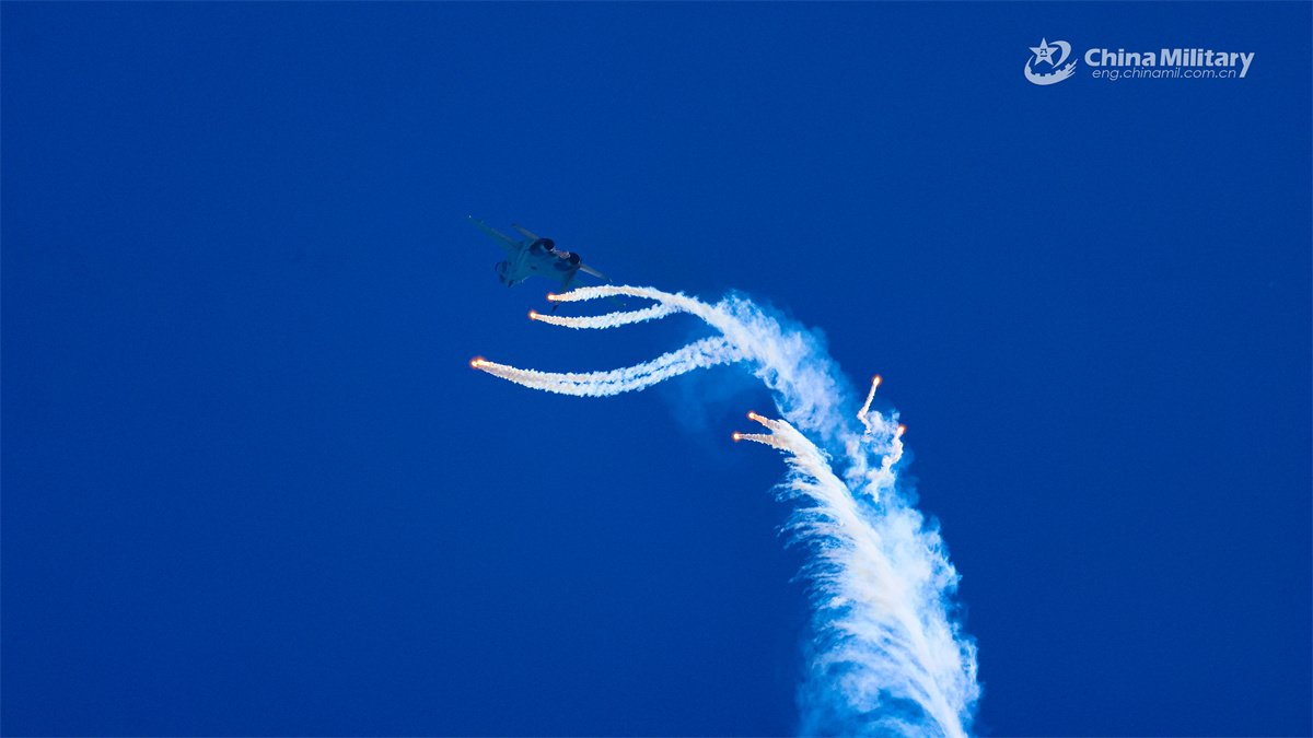 A J-11BS fighter jet attached to a regiment under the Chinese PLA Naval Aviation University releases flares during a combat training exercise. (eng.chinamil.com.cn/Photo by Ping Haonan)