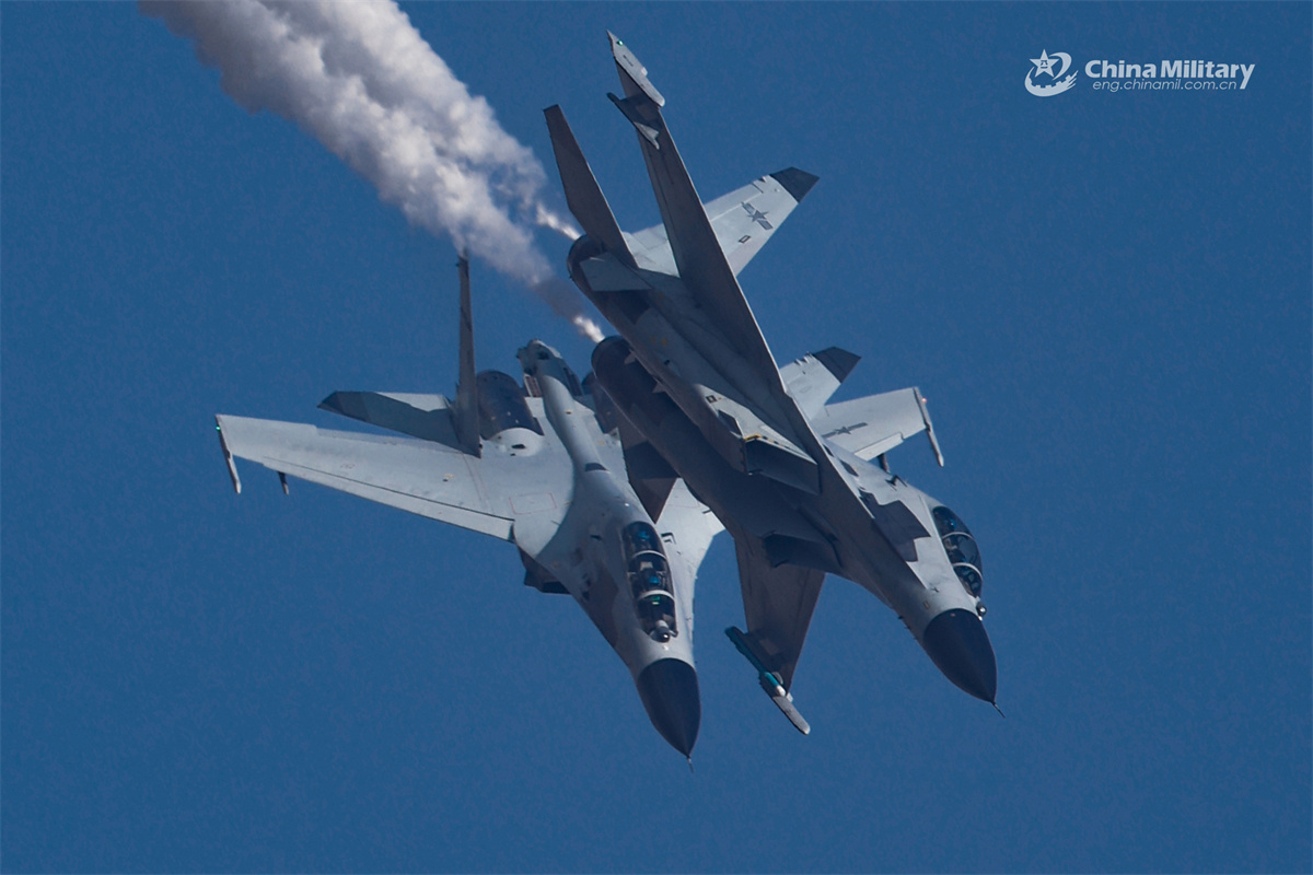 J-11BS fighter jets attached to a regiment under the Chinese PLA Naval Aviation University soar into the sky during a combat training exercise. (eng.chinamil.com.cn/Photo by Zhang Zhiguang)
