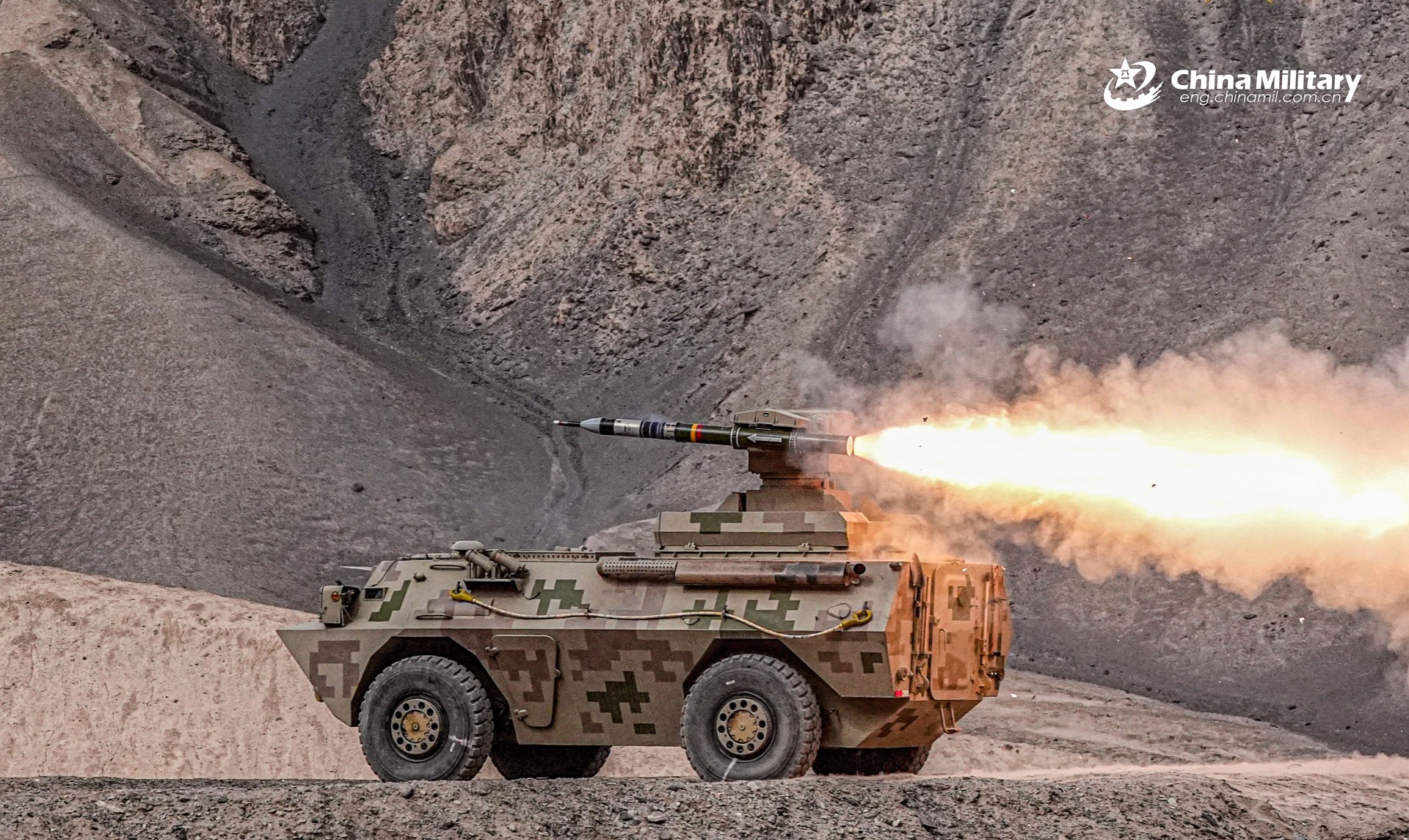 A wheeled HJ-9 anti-tank missile system attached to aunit under the Chinese PLA Army fires at the target during a live-fire shooting training exercise in late October, 2025. (eng.chinamil.com.cn/Photo by Duan Jie)