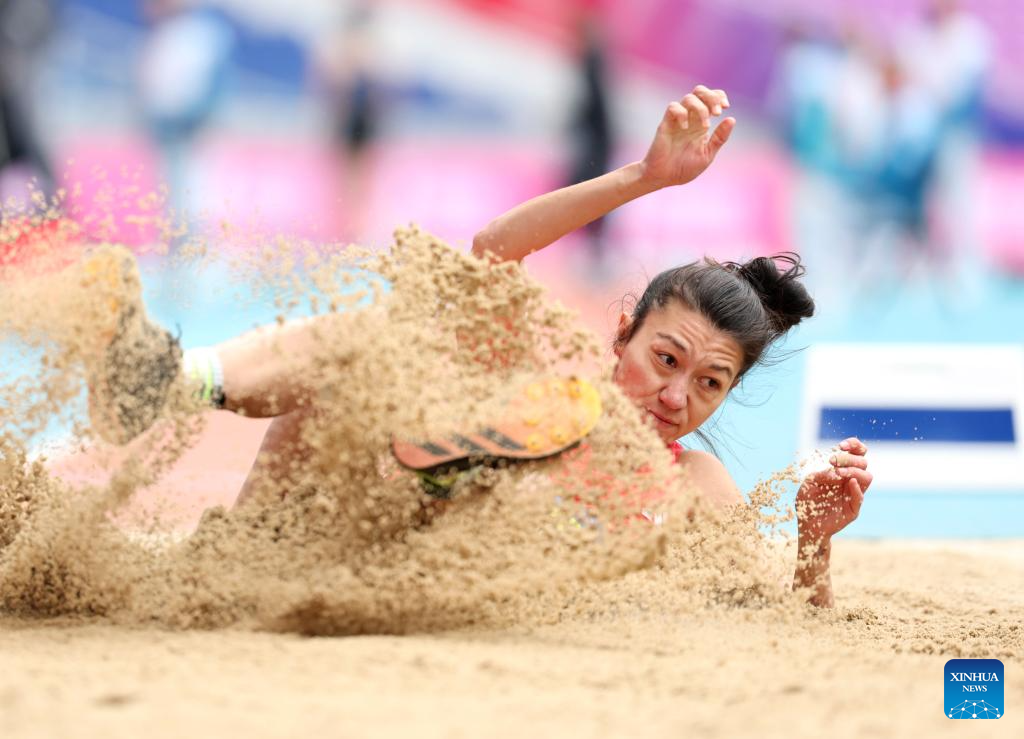 Zheng Ninali of Shanxi competes during the women's heptathlon long jump of athletics at China's 15th National Games in Guangzhou, south China's Guangdong Province, Nov. 19, 2025. (Xinhua/Jiang Han)
