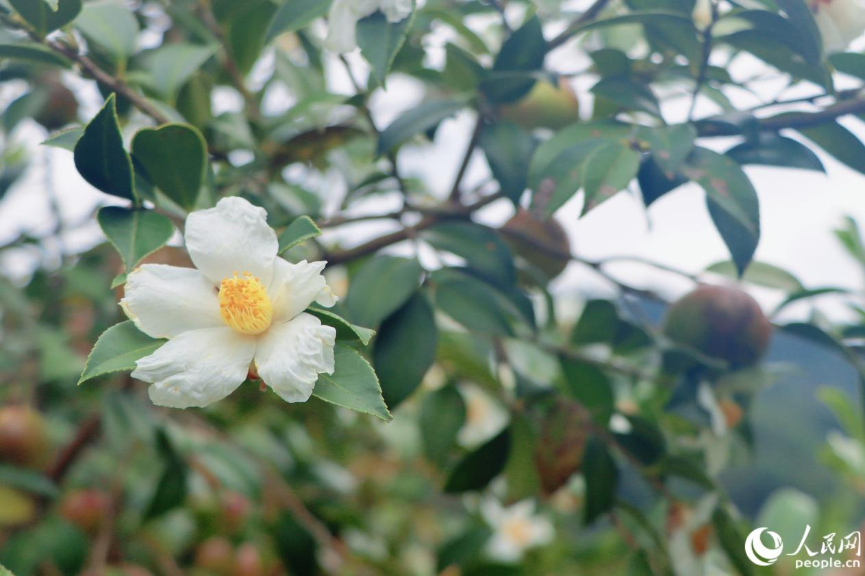 Photo shows tea-oil camellia blooming and fruiting in the same tree. (People's Daily Online/Lin Mingxian)