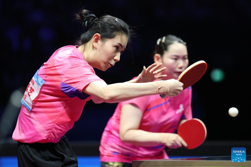 Wang Tianyi (L) of Hebei hits a return in the match against Chen Meng and Wang Xiaotong of Shandong during the first match of women's team final of table tennis between Hebei and Shandong at China's 15th National Games in Macao, south China, Nov. 19, 2025. (Xinhua/Liang Xu)