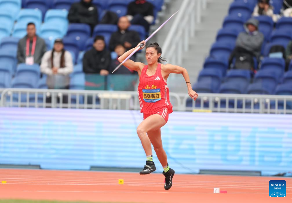 Zheng Ninali of Shanxi competes during the women's heptathlon javelin throw of athletics at China's 15th National Games in Guangzhou, south China's Guangdong Province, Nov. 19, 2025. (Xinhua/Jiang Han)