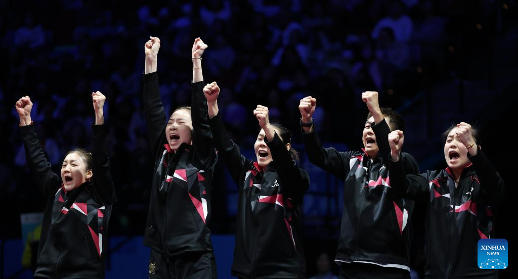 Athletes of team Shandong are seen before the women's team final of table tennis between Hebei and Shandong at China's 15th National Games in Macao, south China, Nov. 19, 2025. (Xinhua/Liang Xu)