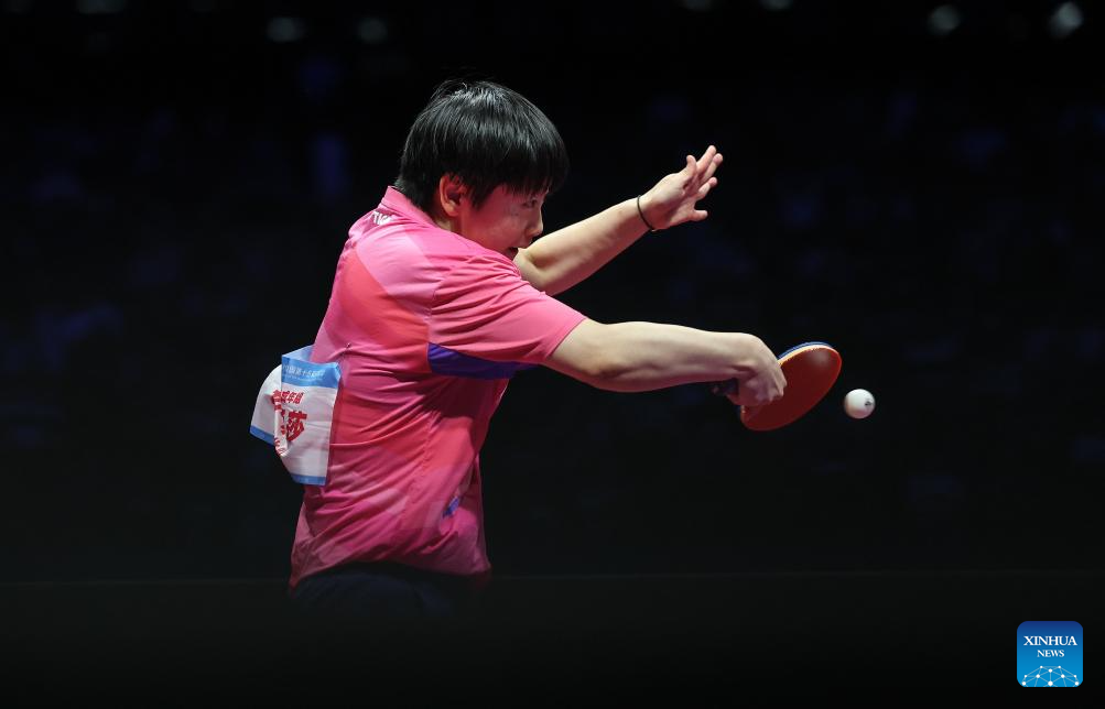 Sun Yingsha of Hebei hits a return in the match against Wang Xiaotong of Shandong during the fourth match of women's team final of table tennis between Hebei and Shandong at China's 15th National Games in Macao, south China, Nov. 19, 2025. (Xinhua/Liang Xu)