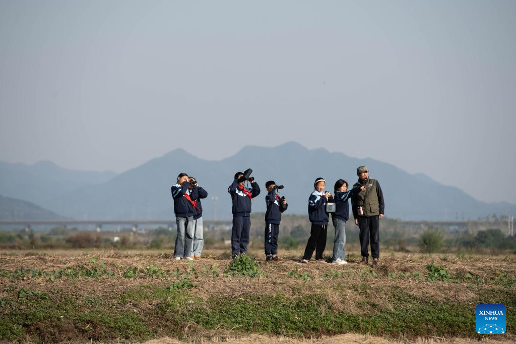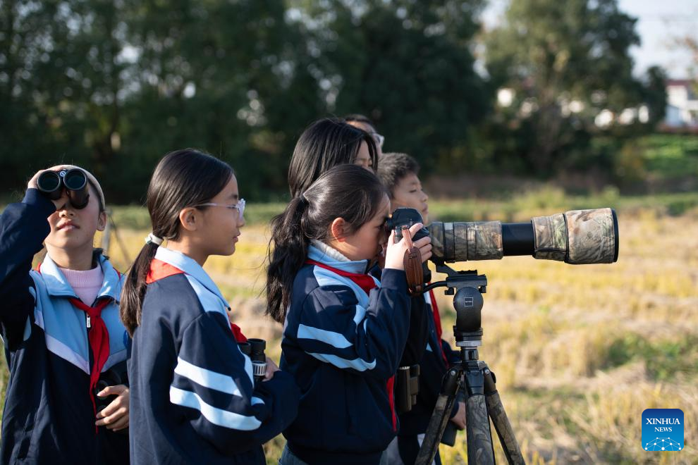 Students of Maotan Primary School observe birds under the guidance of a wild bird conservation volunteer at the Shibasuo provincial nature reserve in Chizhou City, east China's Anhui Province, Nov. 18, 2025. (Xinhua/Zhang Duan)